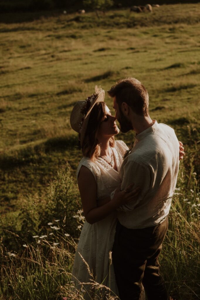On s’est mariés à moins de vingt personnes, et honnêtement c’était génial (le covid était encore présent). Les gens ont souvent peur de réduire leur liste d’invités, mais quand c’est obligatoire, on réalise assez vite qu’en petit comité on peut passer un moment de folie. Des tentes dressées dans le champ devant une petite auberge perdue dans une vallée sauvage des Vosges, un feu de camp le soir, un repas végétarien, une rando le samedi après-midi dans les bois. Pas de plan de table compliqué, une décoration réalisé à la main, et les personnes qui nous semblaient essentielles pour fêter ce moment. Ce mariage-là a tout changé dans notre façon de regarder les mariages des autres. Bien sur, si on avait pu on aurait eu plus de monde, mais le Covid à fait qu’on à du réduire, car nous ne voulions pas reporter. Et au final, c’était super !
