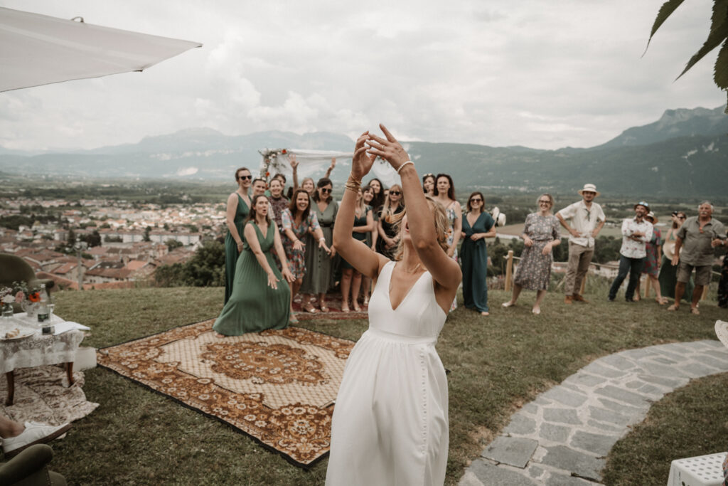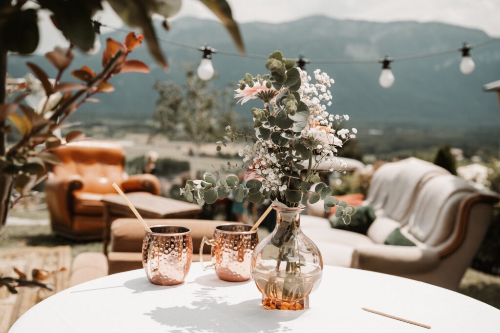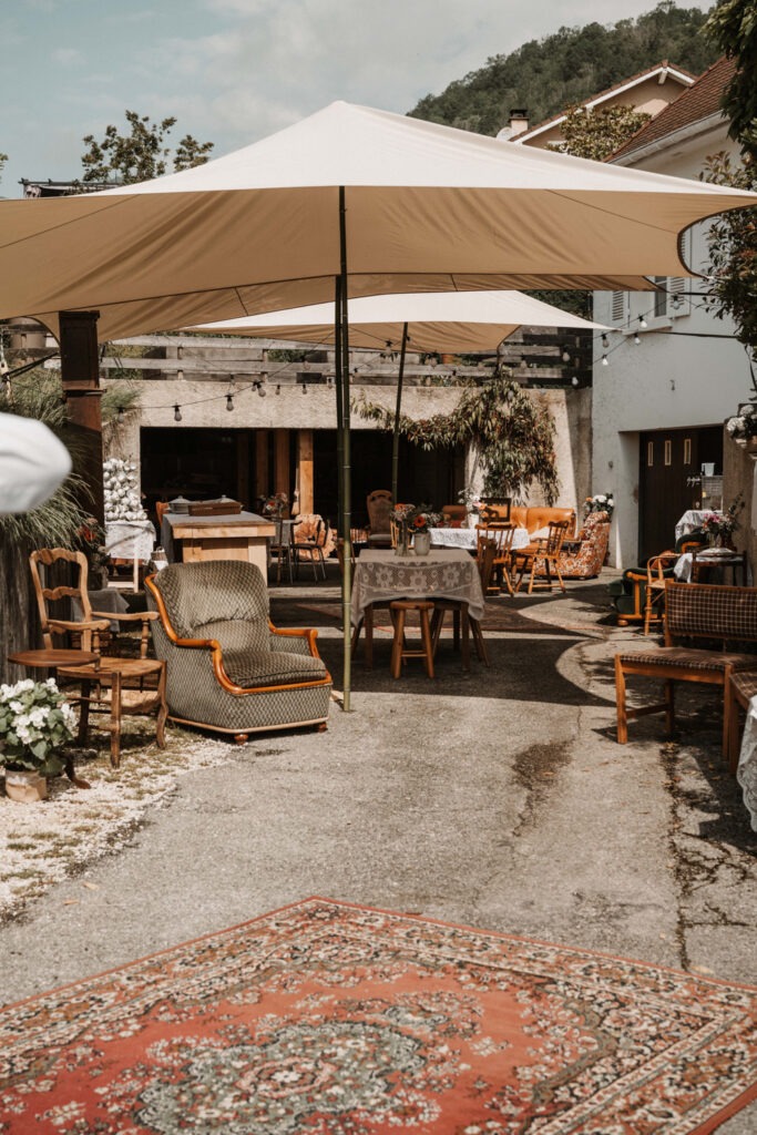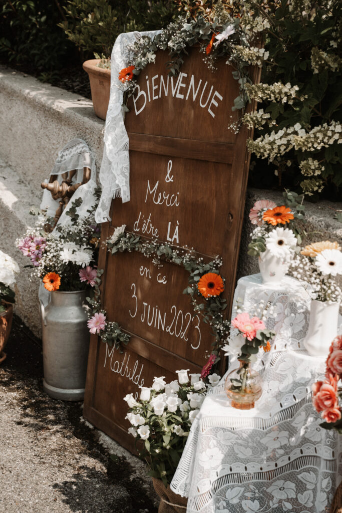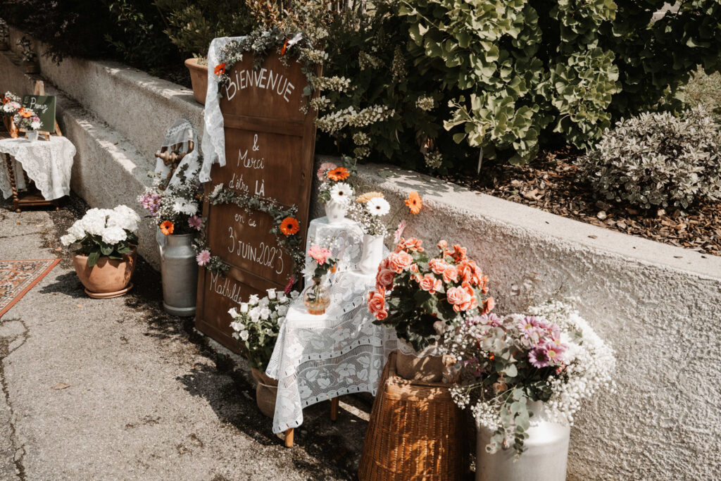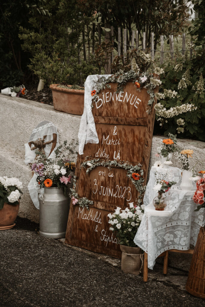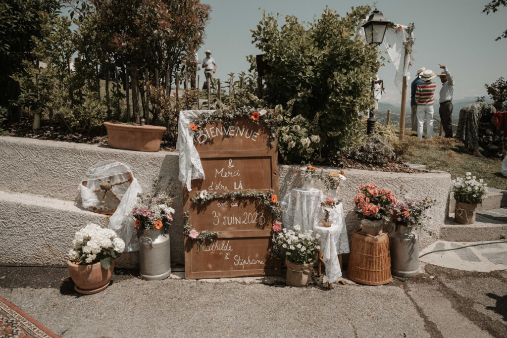 It’s the story of a love that grew from their high school days, becoming stronger over time until it blossomed into a family of five. With two boys and a girl, Mathilde and Stéphane wanted their wedding to be an authentic celebration, infused with a vintage-chic outdoor vibe, surrounded by family and friends. In this article, I take you through the story of this unforgettable day, which took place at Mathilde and Stéphane’s home, with the majestic Vercors mountains as a breathtaking backdrop.