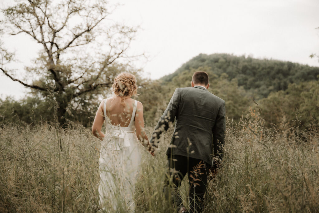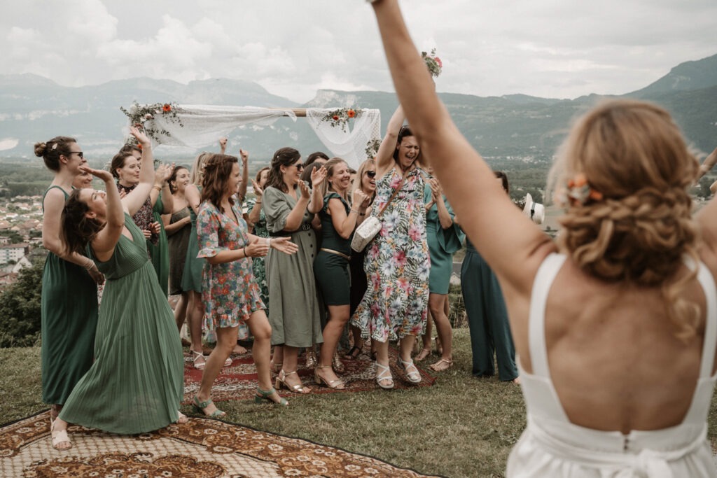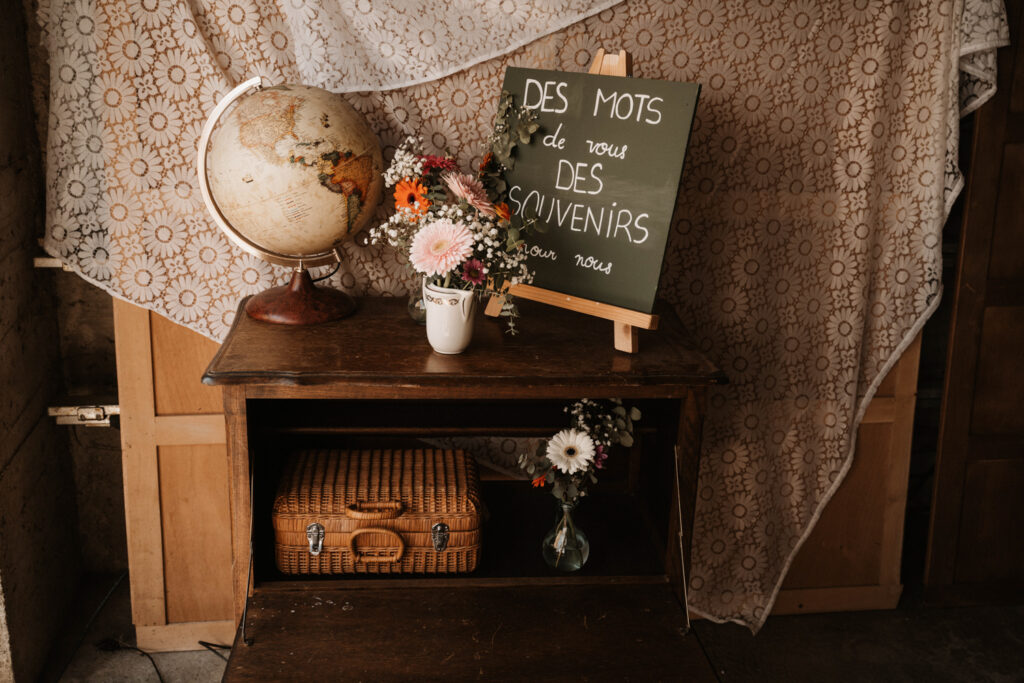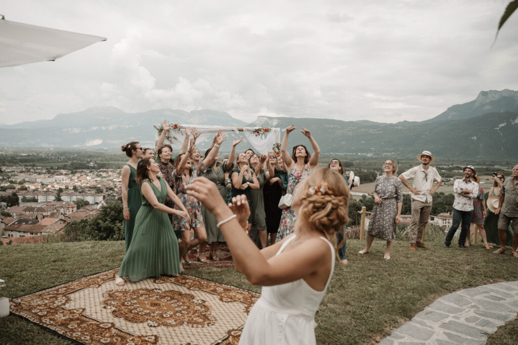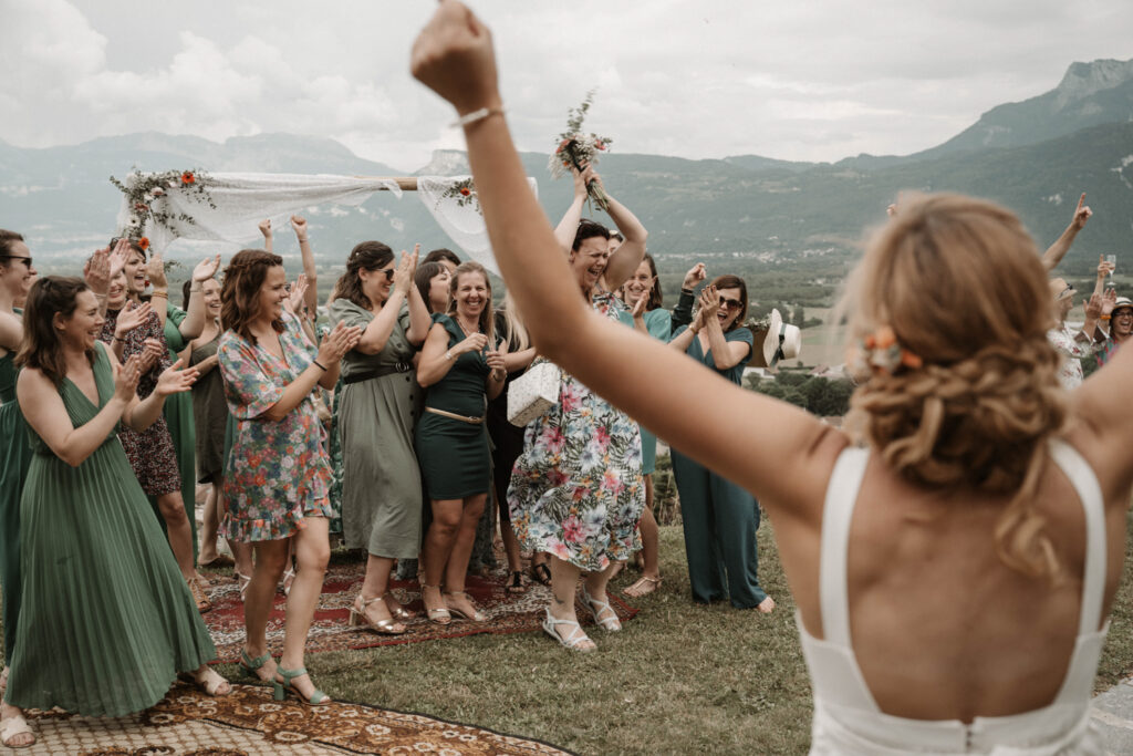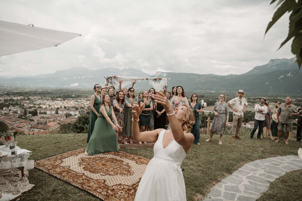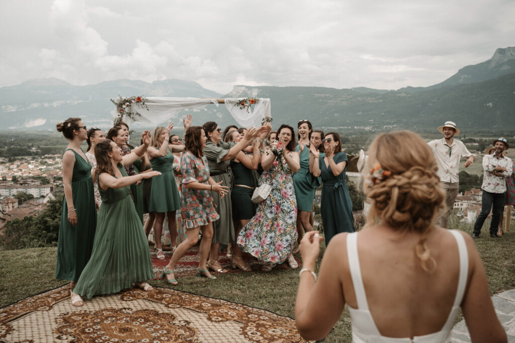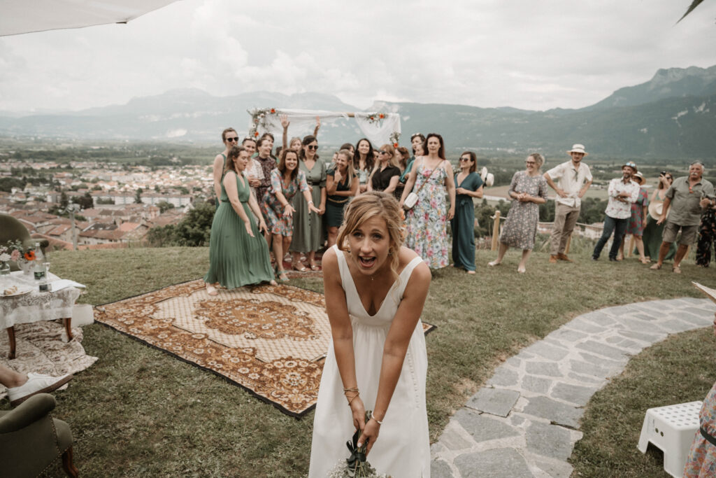 It’s the story of a love that grew from their high school days, becoming stronger over time until it blossomed into a family of five. With two boys and a girl, Mathilde and Stéphane wanted their wedding to be an authentic celebration, infused with a vintage-chic outdoor vibe, surrounded by family and friends. In this article, I take you through the story of this unforgettable day, which took place at Mathilde and Stéphane’s home, with the majestic Vercors mountains as a breathtaking backdrop.