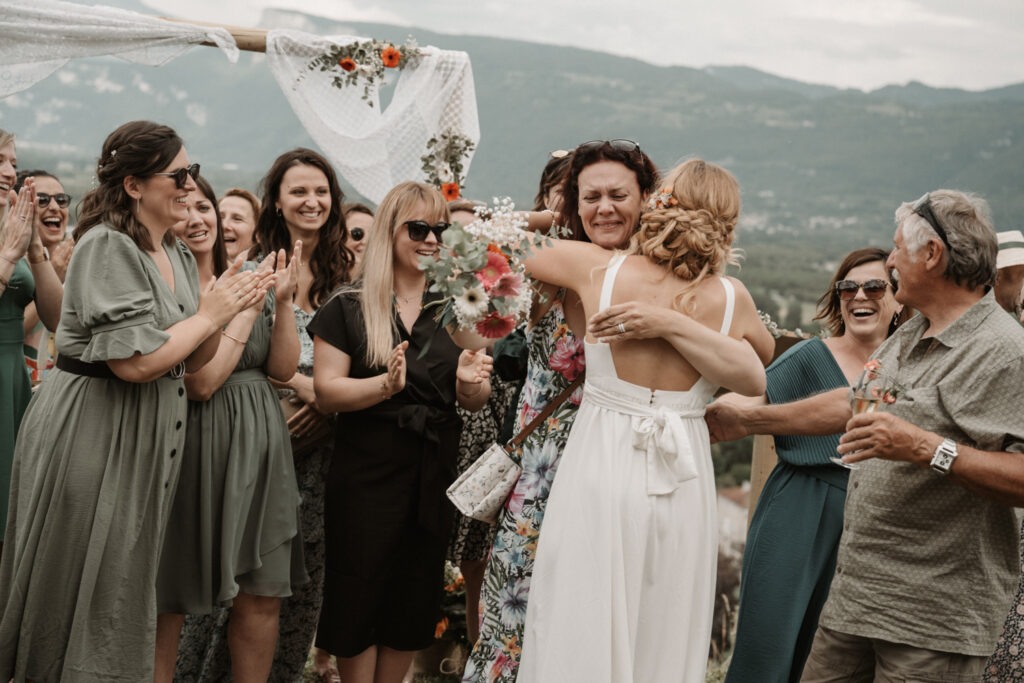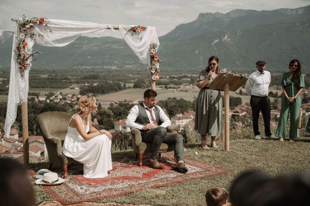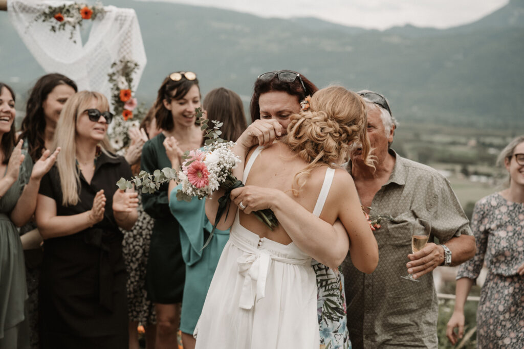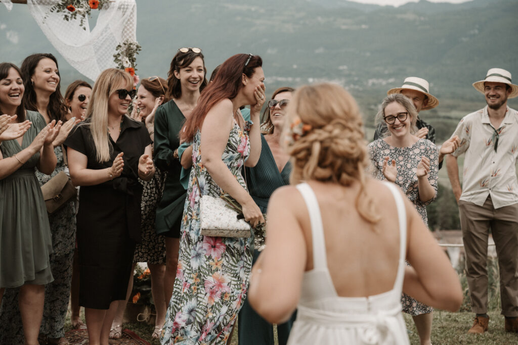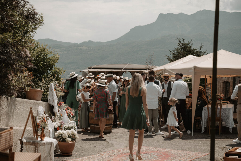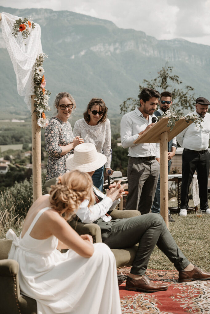 The symbolic ceremony took place around 4 p.m., under radiant sunshine and with a breathtaking view of the Vercors cliffs as a backdrop. It was both an emotional and beautiful moment, as Mathilde and Stéphane declared their love for one another, surrounded by friends and family. The simplicity of the ceremony added to its charm, placing heartfelt emotions at the centre rather than formal traditions.