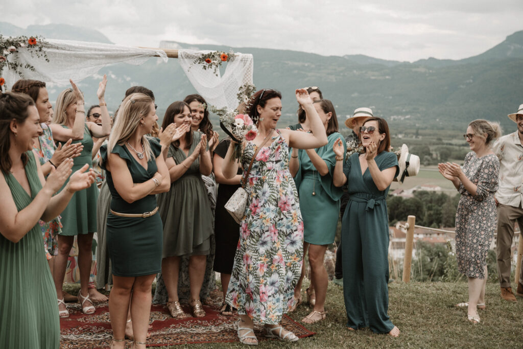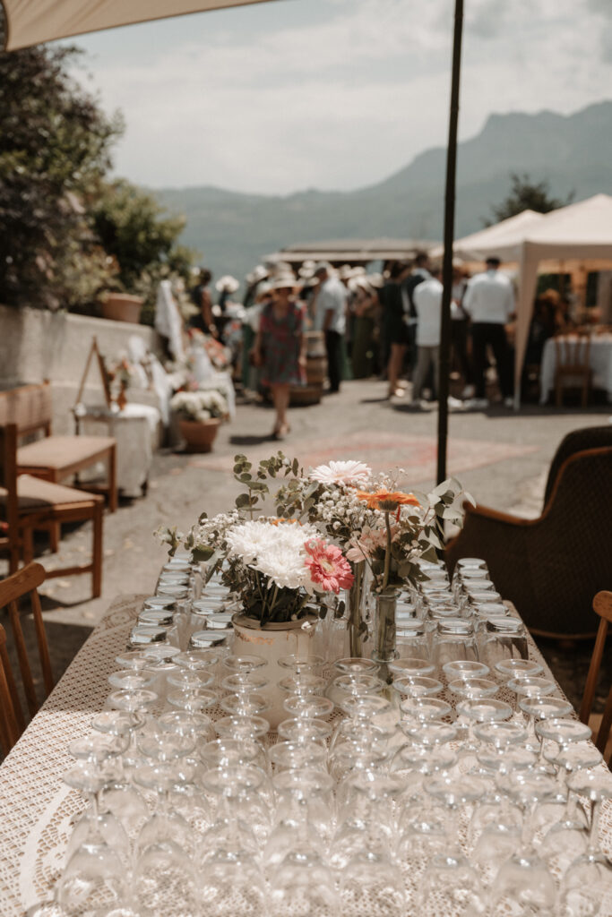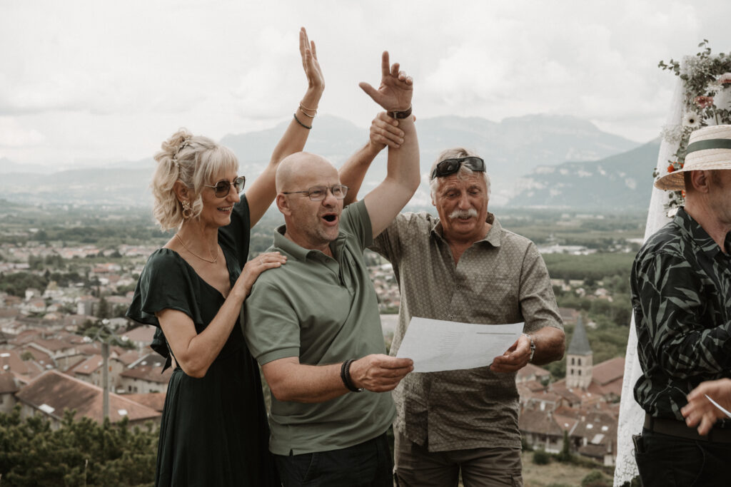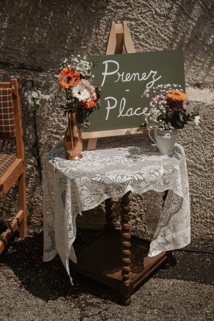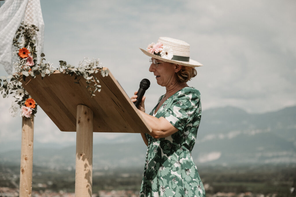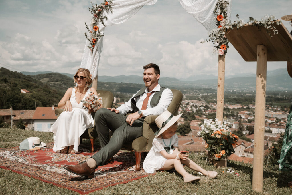 The symbolic ceremony took place around 4 p.m., under radiant sunshine and with a breathtaking view of the Vercors cliffs as a backdrop. It was both an emotional and beautiful moment, as Mathilde and Stéphane declared their love for one another, surrounded by friends and family. The simplicity of the ceremony added to its charm, placing heartfelt emotions at the centre rather than formal traditions.