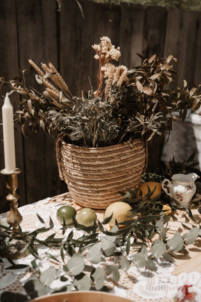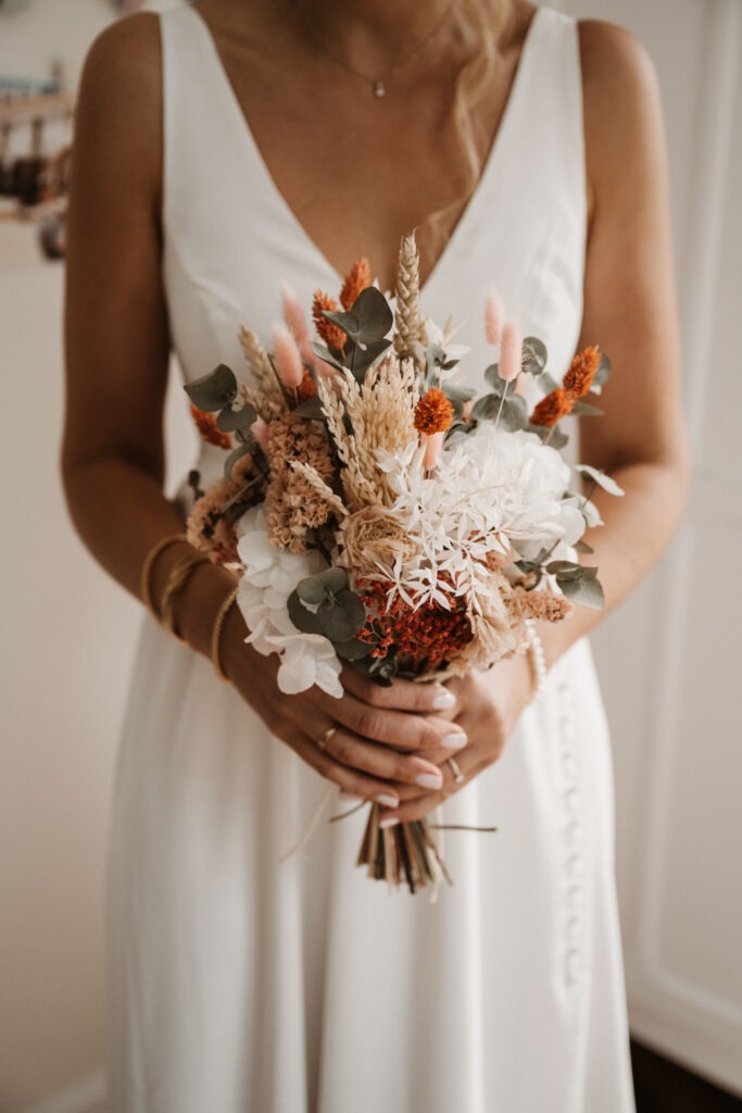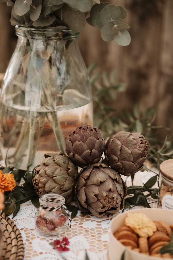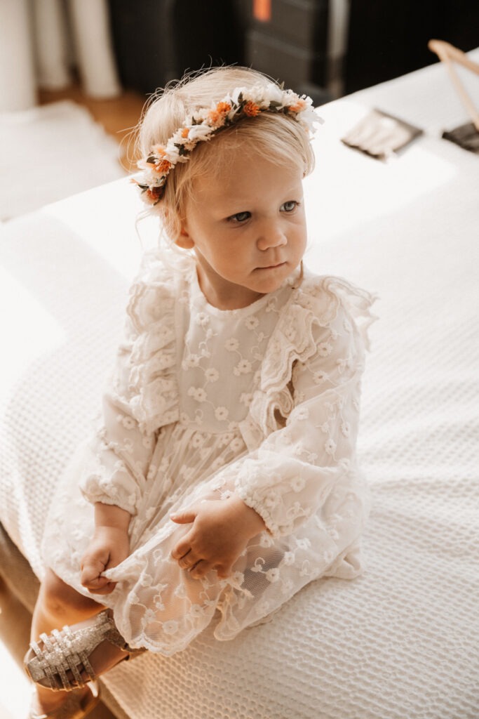 A daytime wedding quickly felt like the perfect option, giving them the chance to enjoy every moment without the pressure of tight schedules or constraints. For Mathilde and Stéphane, it was essential that this day truly reflected their personalities and values. The décor was carefully sourced by the bride over the course of more than a year, and all the floral decorations were entirely created by her. A local florist, Rose Poudrée, crafted the bridal bouquet, flower crown and boutonnieres.