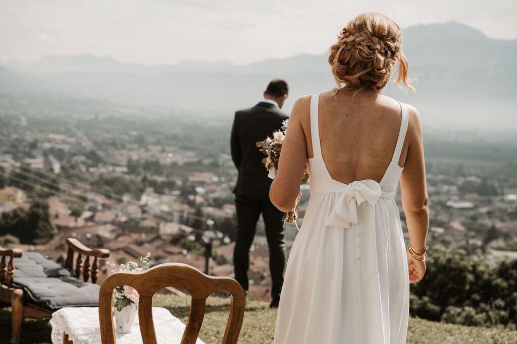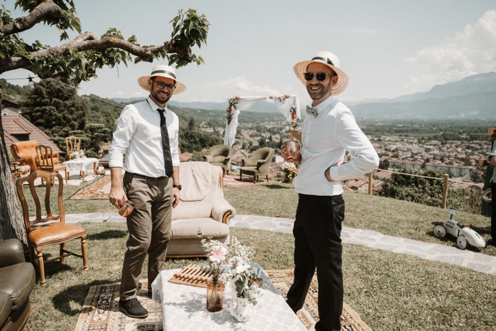 For Mathilde and Stéphane, getting married was an obvious choice, but they had a very clear vision of how they wanted to celebrate it. They wanted to avoid a traditional wedding, with its extravagance and conventions. Instead, they chose a vintage-chic outdoor atmosphere, allowing their family and friends to share an unforgettable moment in their own garden, offering a breathtaking view of the Vercors mountains.