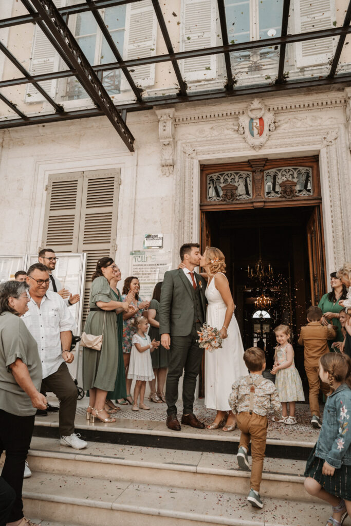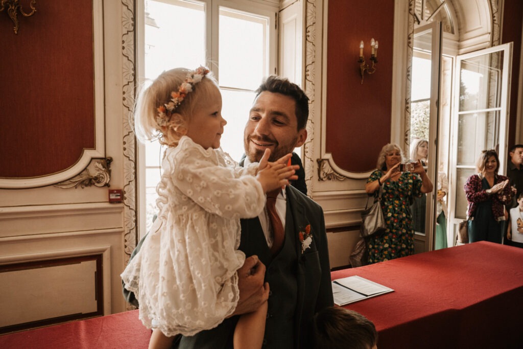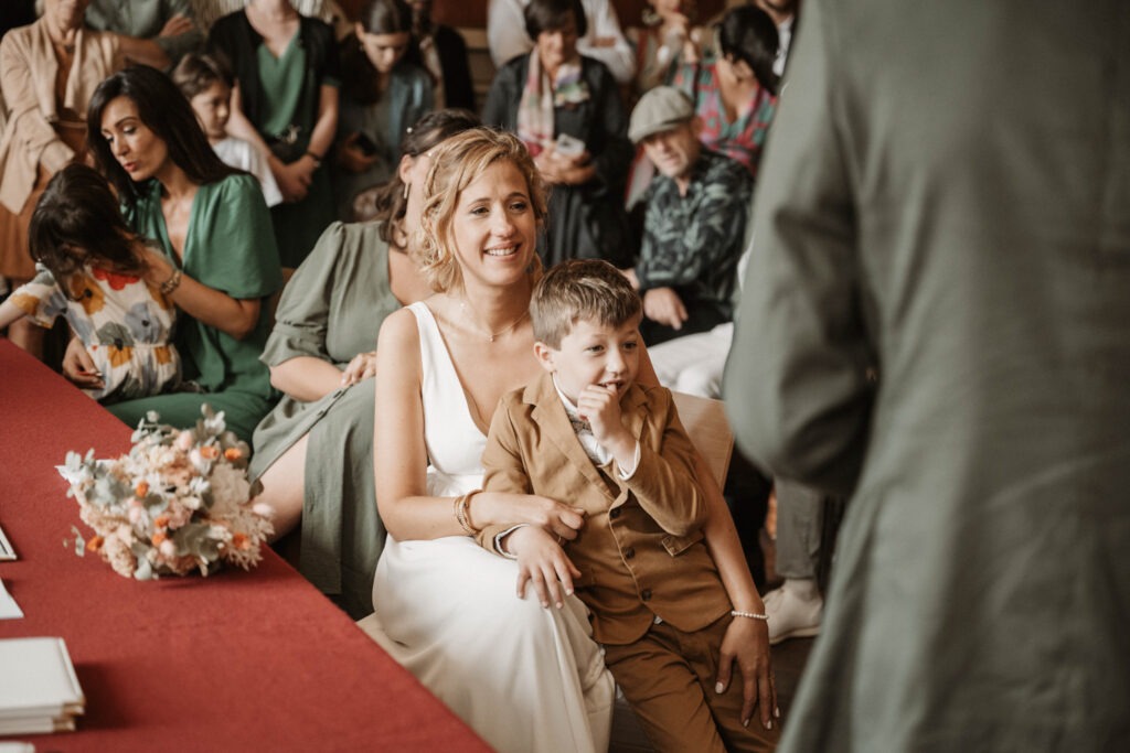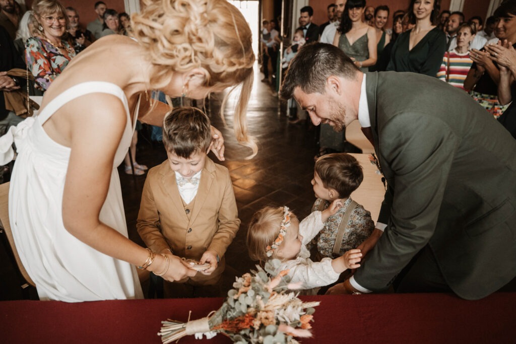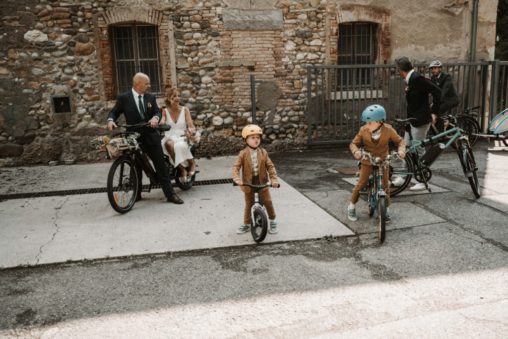 After getting ready, Mathilde and Stéphane headed to the town hall for their civil ceremony — but not in a traditional way. They chose an original approach by cycling to the town hall, accompanied by their three children. Mathilde sat on the back of the bike with her father, sharing a moment of intimacy and connection as they made their way there. It was a deeply personal and unique way to begin their beautiful day.