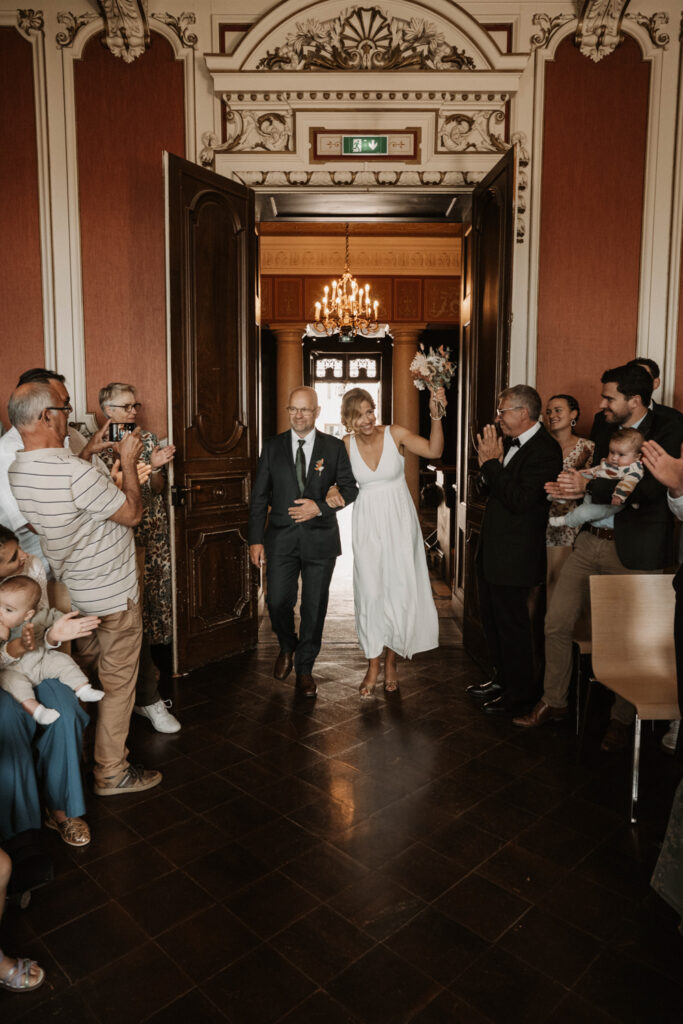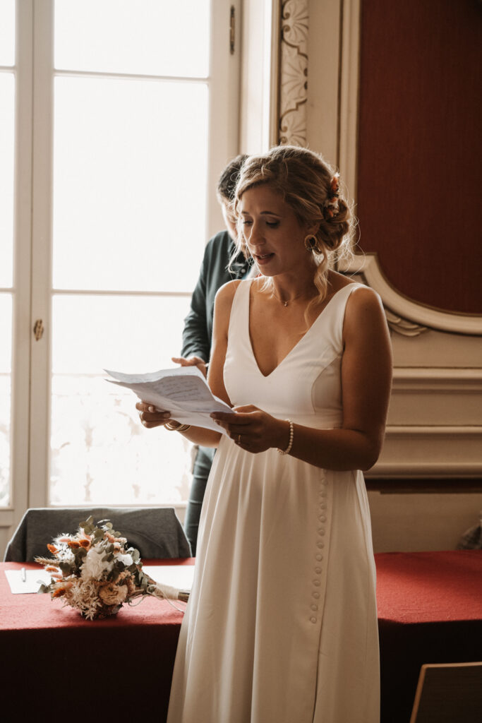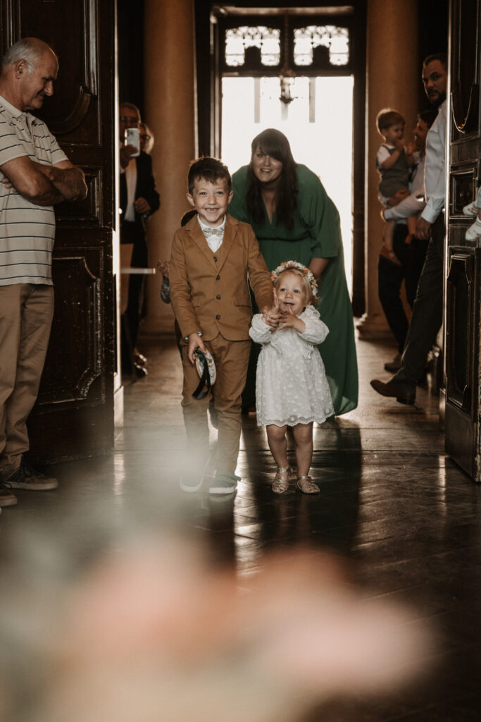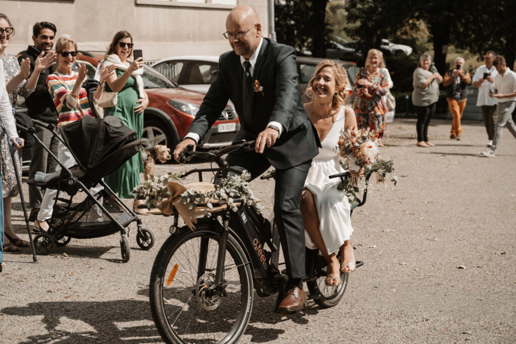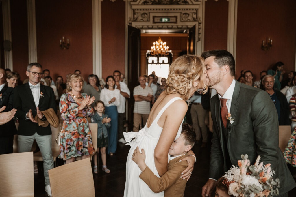 After getting ready, Mathilde and Stéphane headed to the town hall for their civil ceremony — but not in a traditional way. They chose an original approach by cycling to the town hall, accompanied by their three children. Mathilde sat on the back of the bike with her father, sharing a moment of intimacy and connection as they made their way there. It was a deeply personal and unique way to begin their beautiful day.